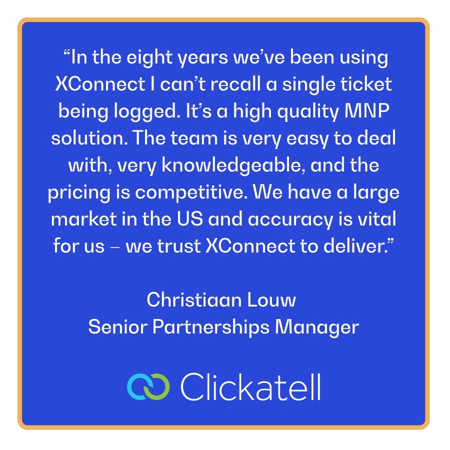 Eight years ago, Christiaan Louw, Senior Partnerships Manager at Clickatell was tasked with finding a high-quality Mobile Number Portability (MNP) solution that would keep costs down and support them in delivering an exceptional SMS service to their customers. He approached XConnect and still uses its service today.