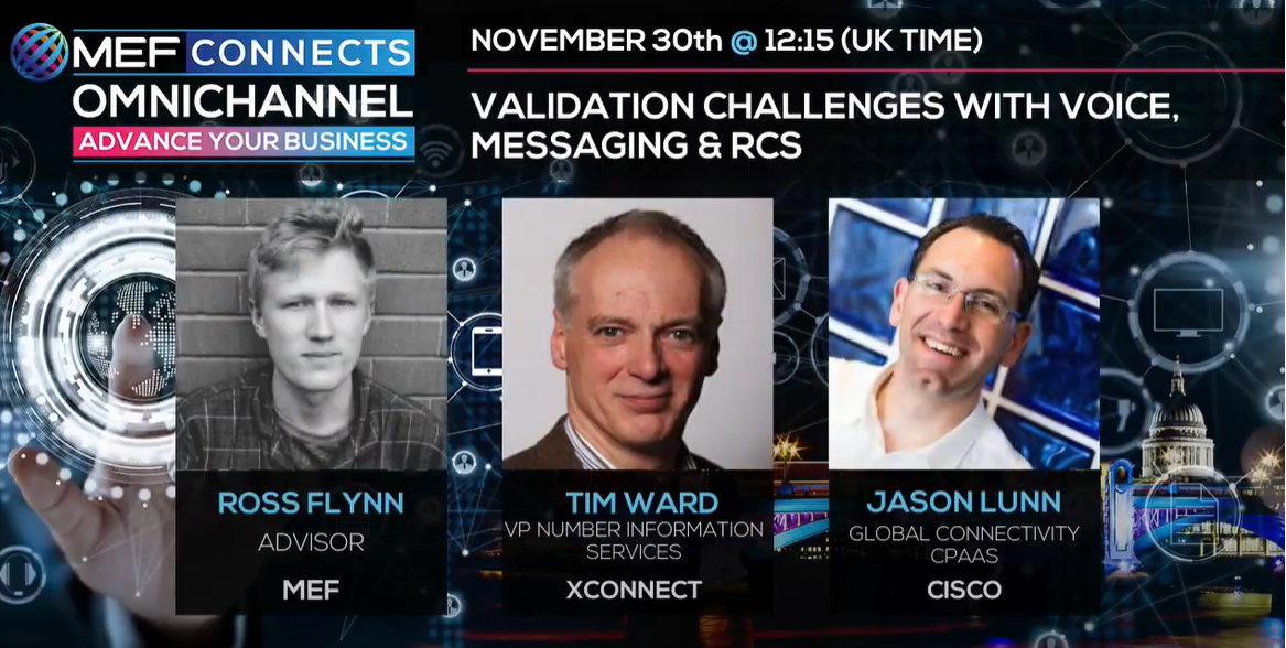Validation Challenges With Voice, Messaging & RCS The panellists for this session were: Ross Flynn, Project Manager – MEF Tim Ward, VP Number Information Services – XConnect Jason Lunn, Global Connectivity CPaaS – Cisco