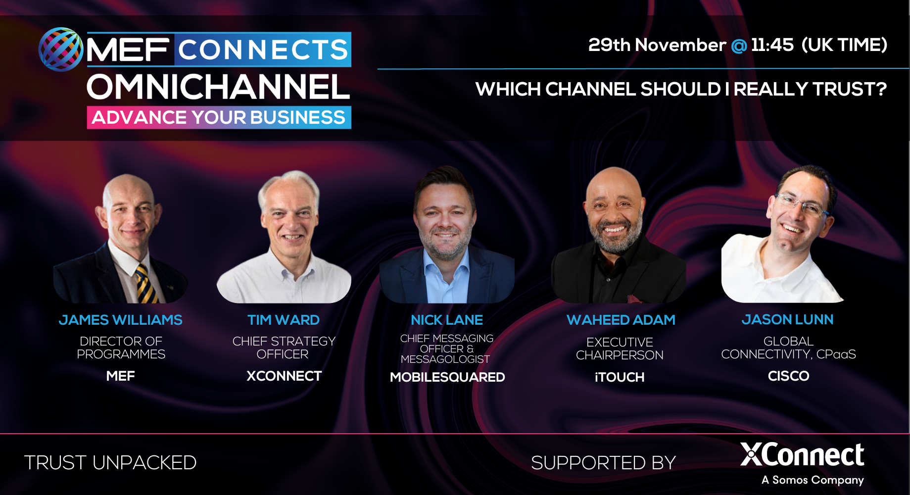 Tim Ward, Chief Strategy Officer – XConnect joined James Williams, Director of Programmes – MEF, Nick Lane, Chief Messaging Officer & Messagologist – Mobilesquared, Jason Lunn, Global Connectivity CPaaS - Cisco and Waheed Adam, Executive Chairperson - iTouch at the MEF #Omnichannel event in London for the panel discussion Which Channel Should I Really Trust?